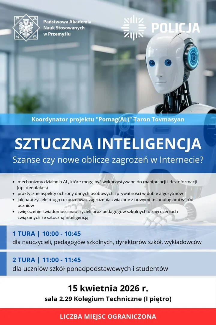 Sztuczna inteligencja coraz częściej ułatwia codzienne życie, ale równie szybko potrafi stać się narzędziem internetowych zagrożeń. W Przemyślu o tej drugiej, mniej wygodnej stronie technologii będą rozmawiać policjanci i wykładowcy podczas spotkania profilaktycznego przygotowanego przez Komendę Miejską Policji i Państwową Akademię Nauk Stosowanych. Zajęcia odbędą się 15 kwietnia 2026 r. w sali 2.29 na pierwszym piętrze Kolegium Technicznego przy ul. Żołnierzy I Armii Wojska Polskiego 1E.